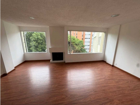 Sala amplia con vista exterior sobre parque y chimenea de leña